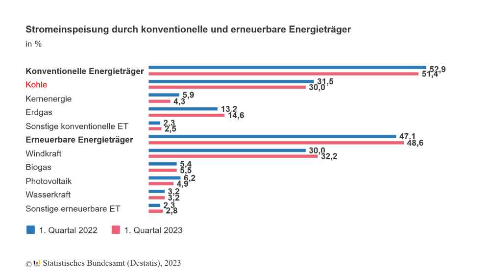 Insgesamt sei die Stromeinspeisung in Deutschland im ersten Quartal rückläufig gewesen, informierten die Bundesstatistiker: 132,8 Milliarden Kilowattstunden Strom entsprachen im Jahresvergleich einem Rückgang um 7,8 Prozent. „Gründe für die ungewöhnlich niedrige Stromeinspeisung waren milde Temperaturen, hohe Strompreise und eine konjunkturelle Abschwächung“, schätzen sie ein.