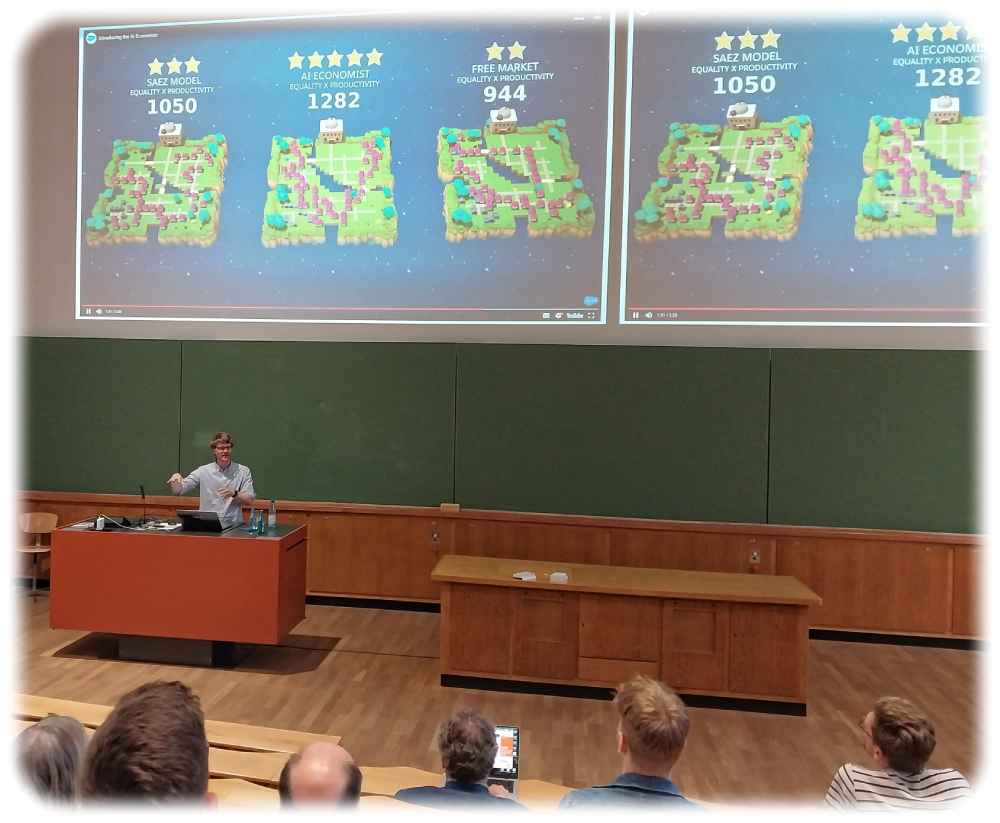 KI-Pionier Richard Socher bei einem Gastvortrag an der TU Dresden. Hier erläutert er gerade, wie KIs in videospiel-ähnlichen Simulationen ein gewünschtes Gleichgewicht zwischen Produktivität, Gleichheit und Steuerlast in einer Volkswirtschaft vorschlagen können. Foto: Heiko Weckbrodt