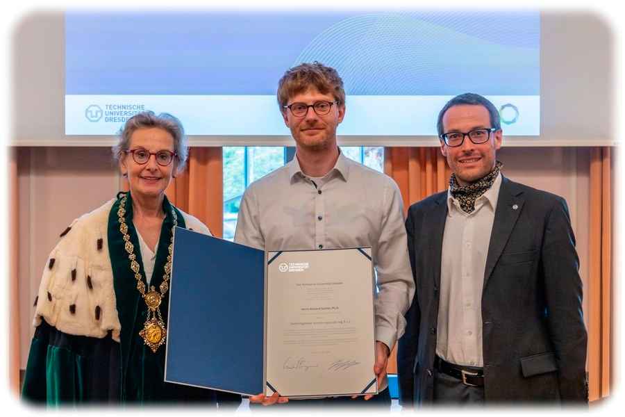 Dr. Richard Socher erhielt seine Urkunde über die Ehrendoktorwürde der TU Dresden aus den Händen von TUD-Rektorin Prof Ursula Staudinger und Informatik-Dekan Prof. Ivo Sbalzarini. Foto: Nils Eisfeld für die TU Dresden