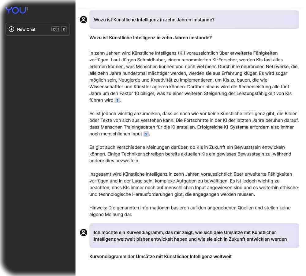 Das Bildschirmfoto (bearbeitet) zeigt die Antwort der KI-basierten Suchmaschine you.com auf die Frage nach den Perspektiven Künstlicher Intelligenz. BSF: Heiko Weckbrodt