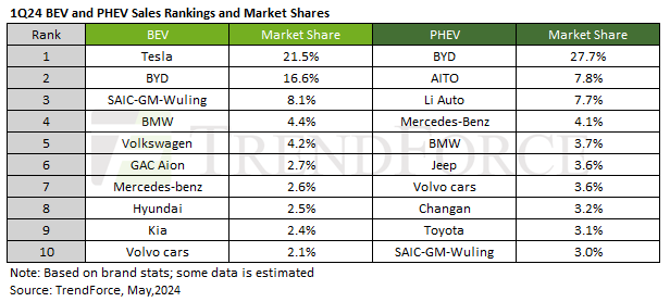 Trendforce: Weltweit wurden im ersten Quartal 2024 rund 2,842 Millionen Fahrzeuge mit Akku-, Hybrid- oder Wasserstoff-Antrieb verkauft – 17 % mehr.