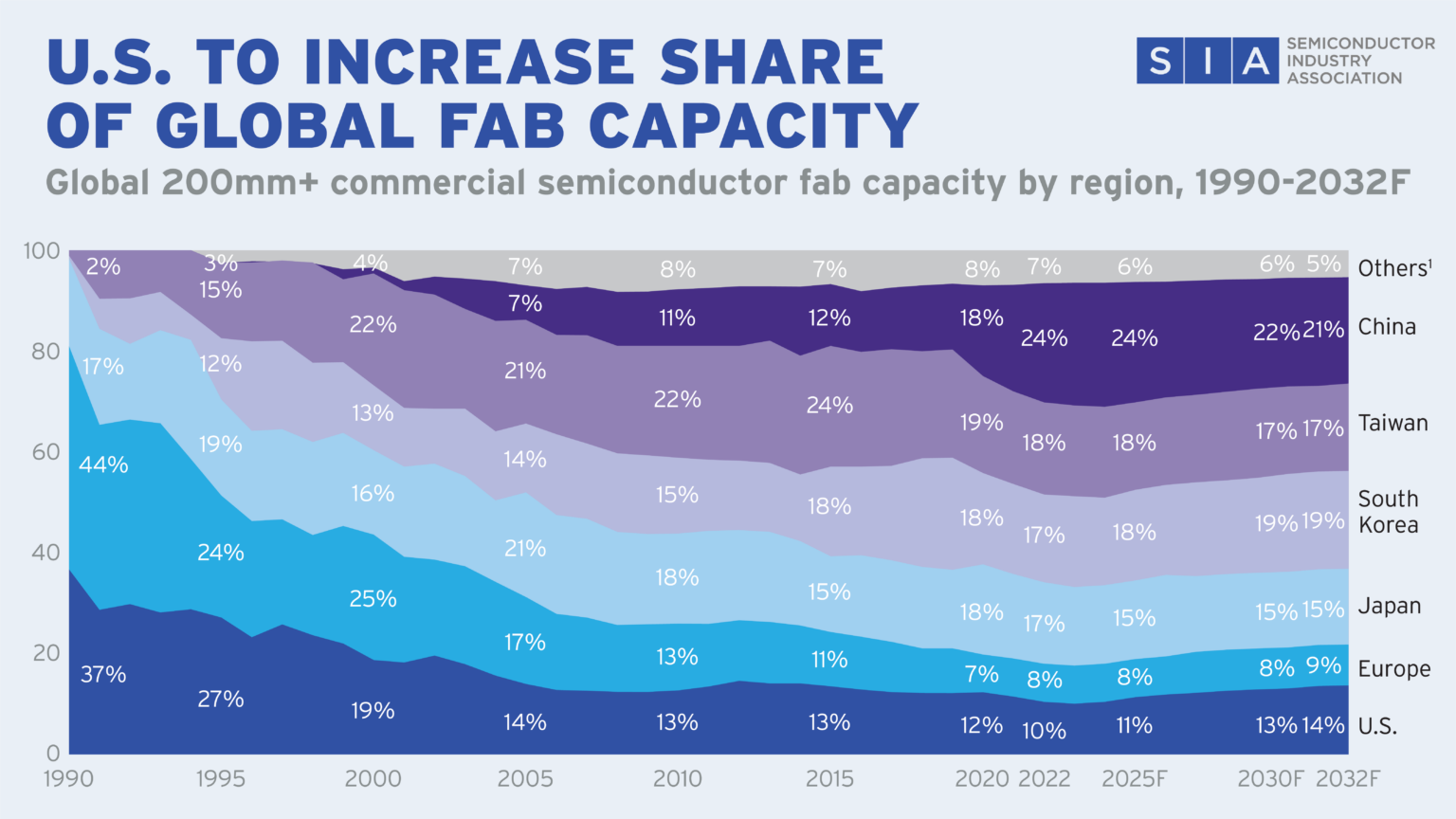 Und für die USA prophezeien die SIA-Analysten in den nächsten Jahren auch wieder einen Chip-Aufschwung: War der US-Anteil seit 1990 von damals 37 Prozent auf inzwischen nur noch zehn Prozent abgesackt, sagt die neue Studie „Strengthening The U.S. Semiconductor Supply Chain“ für 2032 einen Anteil um die 14 Prozent voraus. „Die USA werden zwischen 2024 und 2032 mehr als ein Viertel (28 %) der weltweiten Investitionsausgaben aufbringen – schätzungsweise 646 Milliarden US-Dollar – ein Betrag, der nur von Taiwan übertroffen wird“, heißt es in einer SIA-Zusammenfassung. 2032, also zehn Jahre nach dem Inkrafttreten des US-Chipgesetzes, werde sich die Produktionskapazität für Halbleiter in Amerika verdreifacht haben, „was der höchsten Wachstumsrate der Welt entspricht“, so die Autoren.