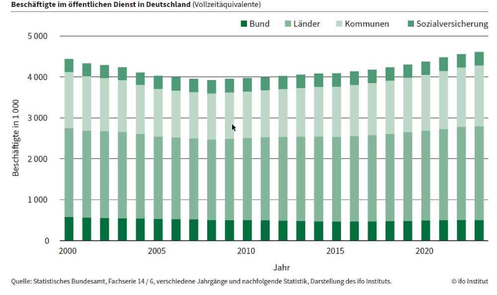 Dies binde nicht nur Steuermittel und Personal, sondern verhindere auch strukturelle Innovationen, warnt der Ifo-Forscher: „Während Unternehmen Automatisierung nutzen und Arbeitsprozesse verschlanken, werden im öffentlichen Dienst neue Stellen geschaffen, statt alte Aufgaben und Prozesse zu hinterfragen“, meint Thum. „Diese Entwicklung überfordert auf Dauer die Steuerzahler. Sie gefährdet langfristig aber auch die gesamte Wirtschaft, da ihr der öffentliche Sektor die Arbeitskräfte entzieht. Damit verschärft er den Fachkräftemangel in der gesamten Wirtschaft.“ Stattdessen müsse die öffentliche Verwaltung endlich die Digitalisierung vorantreiben, um mit den Effizienzgewinnen Personal einzusparen.