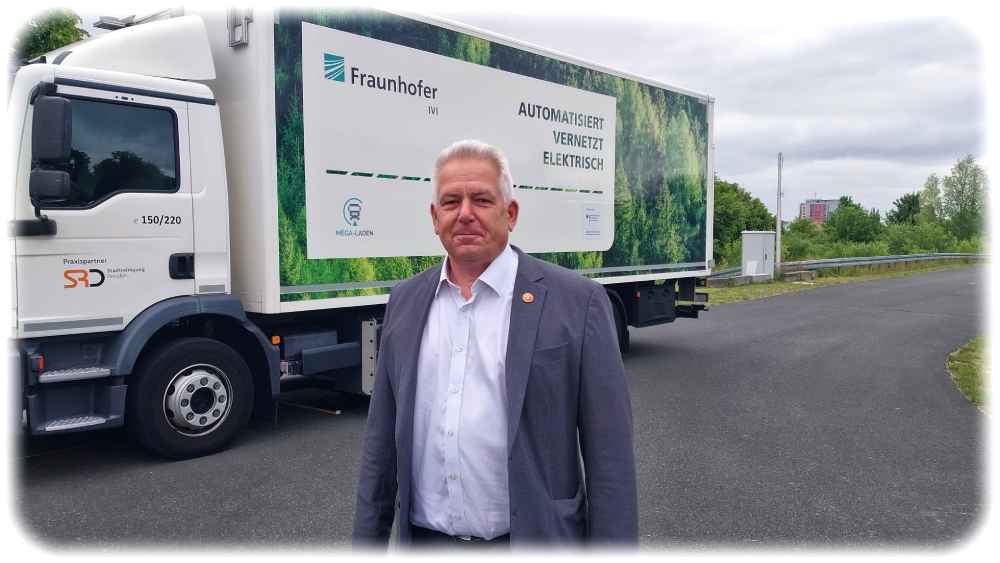Alf Schwaten von der Stadtreinigung Dresden vor dem Elektrolaster, der das „Megaladen“ von unten auf dem Fraunhofer-Testoval im Dresdner Süden testet. Foto: Heiko Weckbrodt