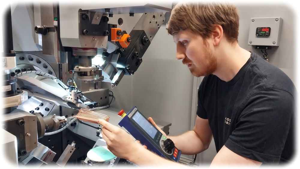 Ingenieur Milan Düwel richtet bei Additive Drives Dresden eine CNC-Biegemaschine ein. Foto: Heiko Weckbrodt