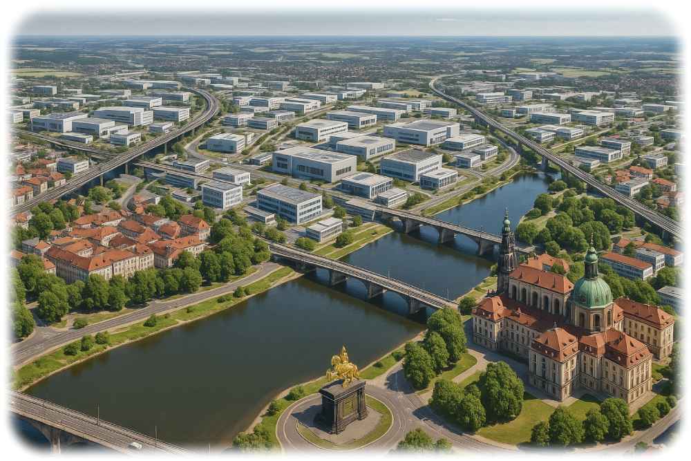 So stellt sich eine KI eine Metropolregion Dresden vor. Ganz so wird es wohl nicht kommen… Visualisierung: KI ChatGPT, Prompt: Heiko Weckbrodt
