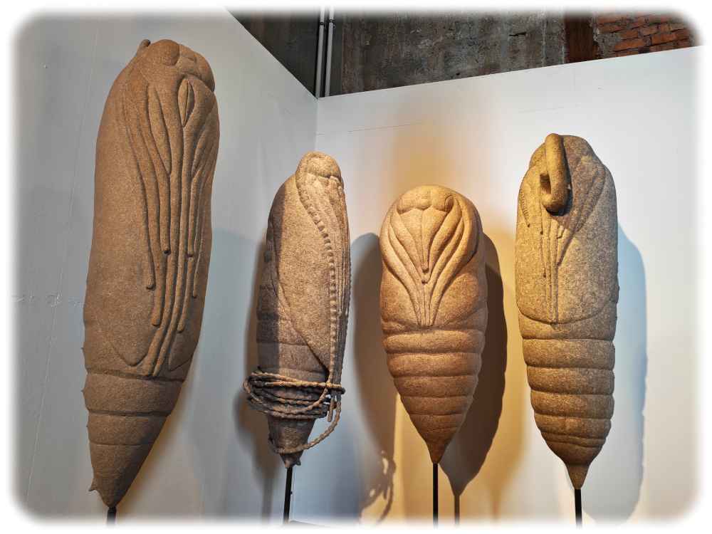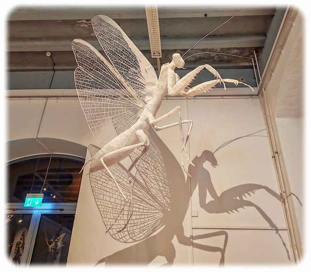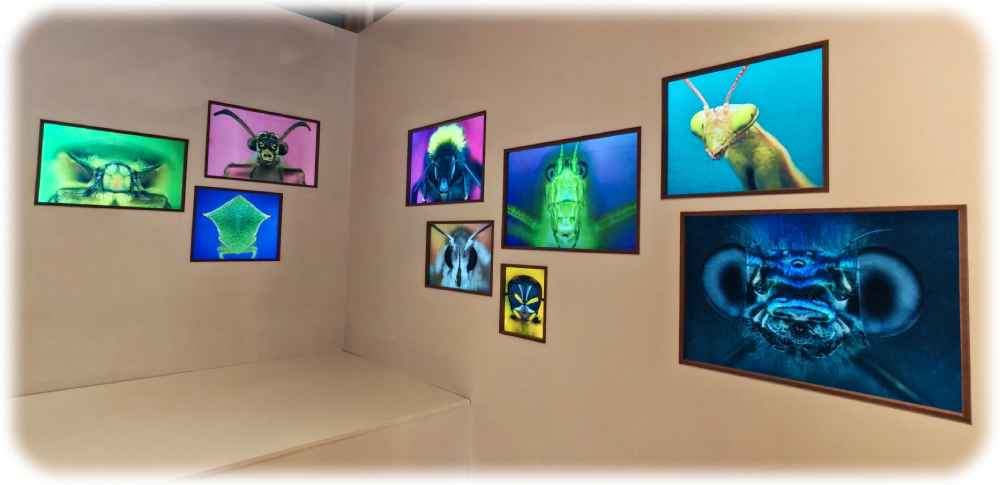 Daher nähert sich „iNUVERSUMM“ auch aus mehreren Blickwinkeln der Welt der Insekten. So säumen überfraugroße Kokon-Plastiken der Bildhauerin Sabine Emmerich die Treppe hinauf in den ersten Stock, mächtig wie chinesische Terrakotta-Krieger: Steht der Mensch vor solch einer zwei Meter großen Insektenpuppe, kommt er sich plötzlich klein und unbedeutend vor. An die Decke hat sie weiße Skulpturen von Grashüpfern, Motten und Libellen gehängt, ins Riesige vergrößert. Darunter ermöglichen Wabenspiegel und -Brillen den Besuchern, die Welt durch Insektenaugen zu sehen. Gleich daneben finden sich superscharfe Aufnahmen ausgewählter Insekten. Durch die extreme Vergrößerung wirken die dunklen Augen besonders alien-artig. „Wir können diese Augen sehen – aber nicht hineinsehen“, erklärt der Kurator diesen Effekt.