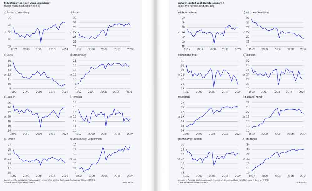 Nachvollziehbar ist zwar die Annahme der Ifo-Autoren, dass die Industrieanteile dabei mit ausschlaggebend sind. Denn die Industrie und vor allem der Automobilbau hatten zuletzt besonders unter hohen Energiepreisen, verlorener Wettbewerbsfähigkeit im Ausland und den Zoll- und Wirtschaftskriegen von US-Präsident Donald Trump gelitten. Aber wie Bayern, Sachsen und andere Beispiele zeigen, kann dies nicht allein die Differenzen zwischen den Bundesländern erklären. Denn gerade in besonders stark geschrumpften Ländern war der Industrieanteil an der Wirtschaft in den vergangenen Jahren besonders deutlich zurückgegangen, in NRW zum Beispiel von 27 Prozent im Jahr 1992 auf 19 Prozent im Jahr 2024. In Bayern ist er im selben Zeitraum sogar noch gestiegen: von 27 auf 30 Prozent. Auch Sachsen und Thüringen haben einen Teil der starken Verluste in der Nachwendezeit wieder wettgemacht und haben ihren Industrieanteil auf 26 Prozent (Sachsen) beziehungsweise 29 Prozent (Thüringen) gesteigert.