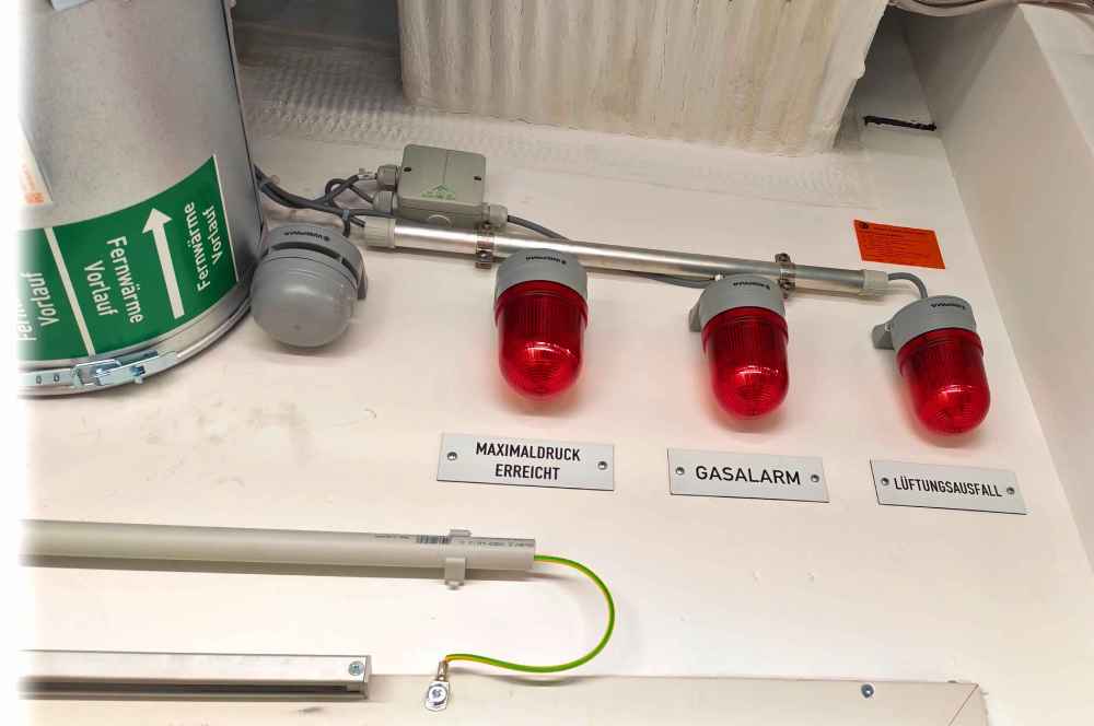 Als Kühlmittel nutzt die Wärmepumpe Ammoniak. Daher auch die Gas-Warnanlagen. Foto: Heiko Weckbrodt