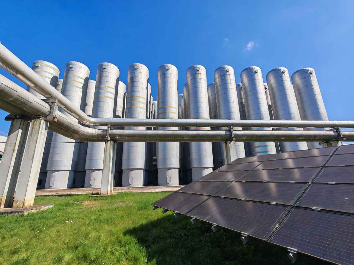 Eine Photovoltaik-Anlage in Ost-West-Ausrichtung und dahinter Warmwasserspeicher im Innovationskraftwerk Dresden-Reick. Foto: Heiko Weckbrodt